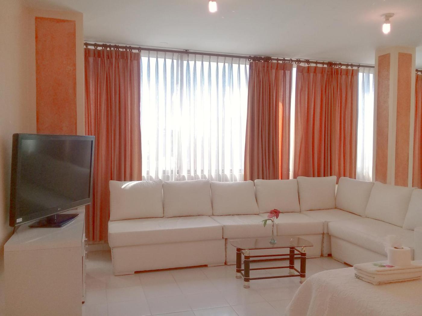 Suite. The suite has 1 bedroom and 1 bathroom with a shower and free toiletries. The suite features a wardrobe, a sofa, a tiled floor, as well as a flat-screen TV with cable channels. The unit has 1 bed. ;